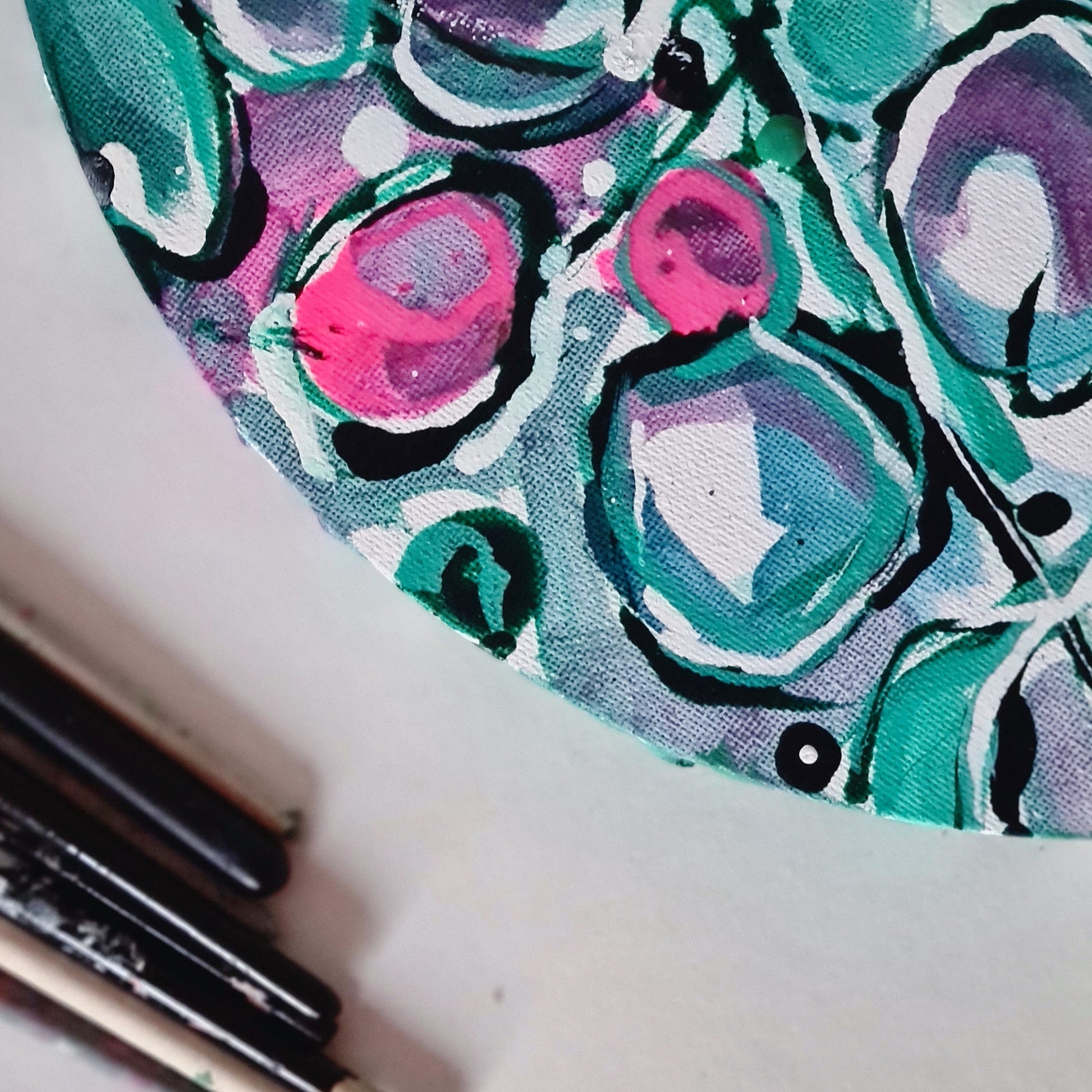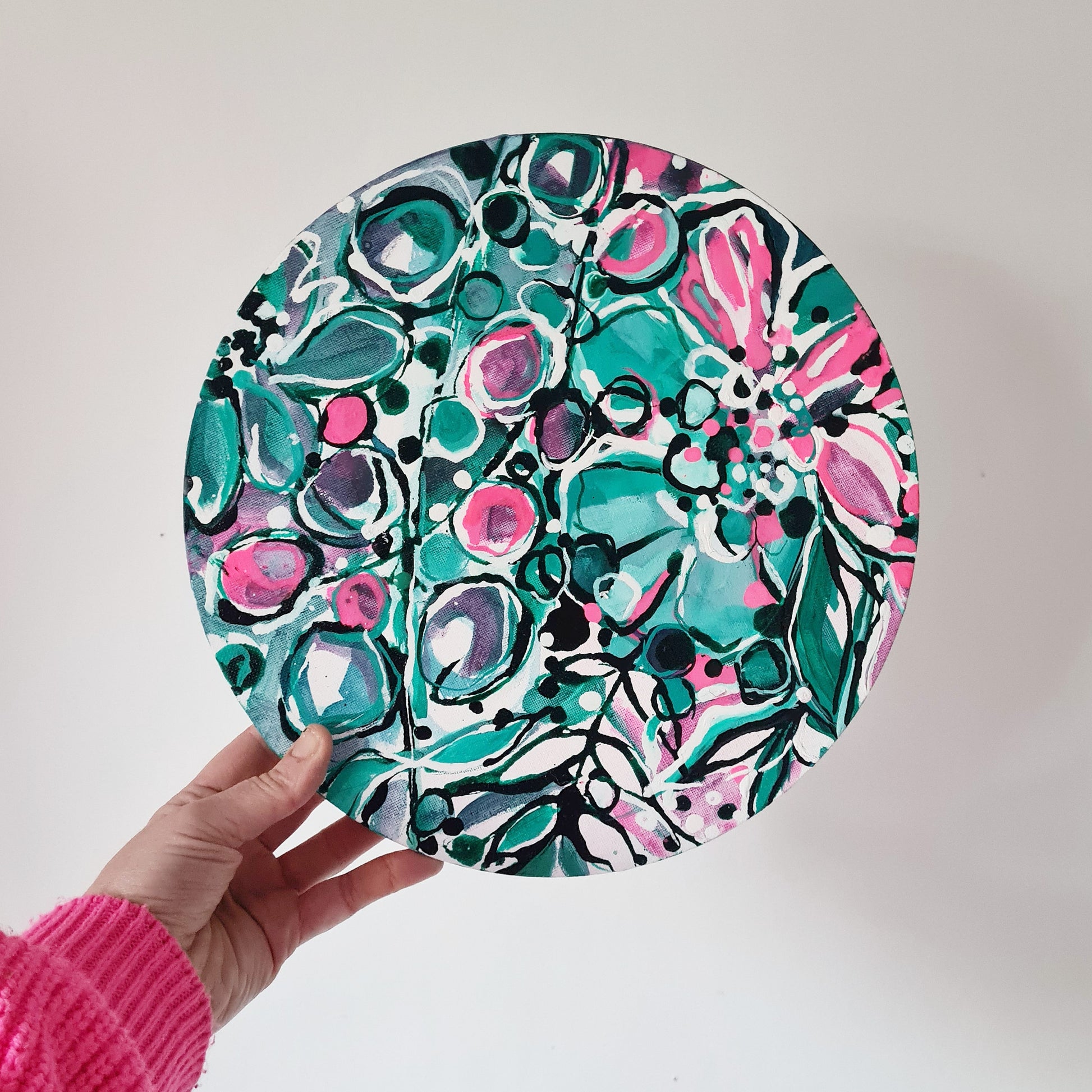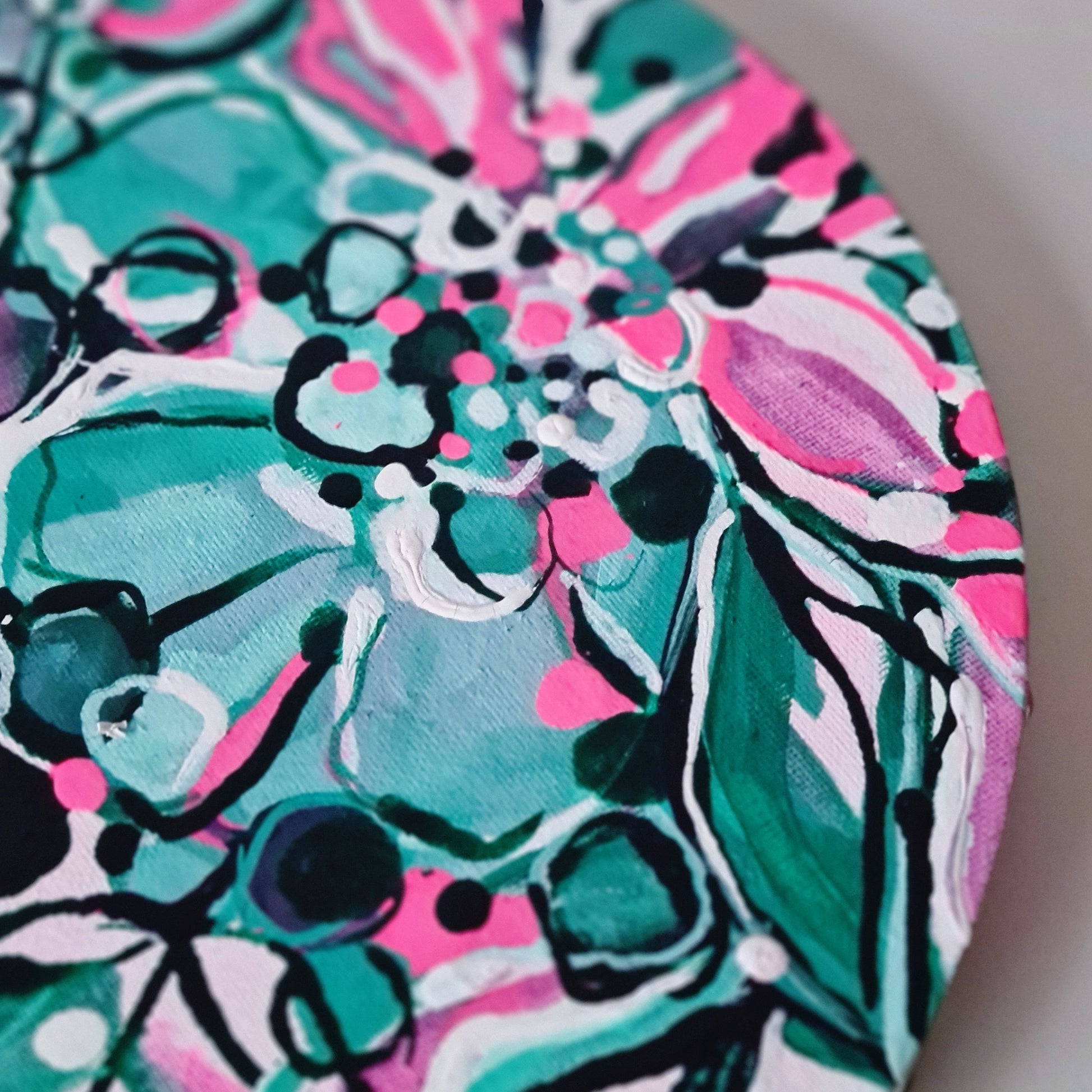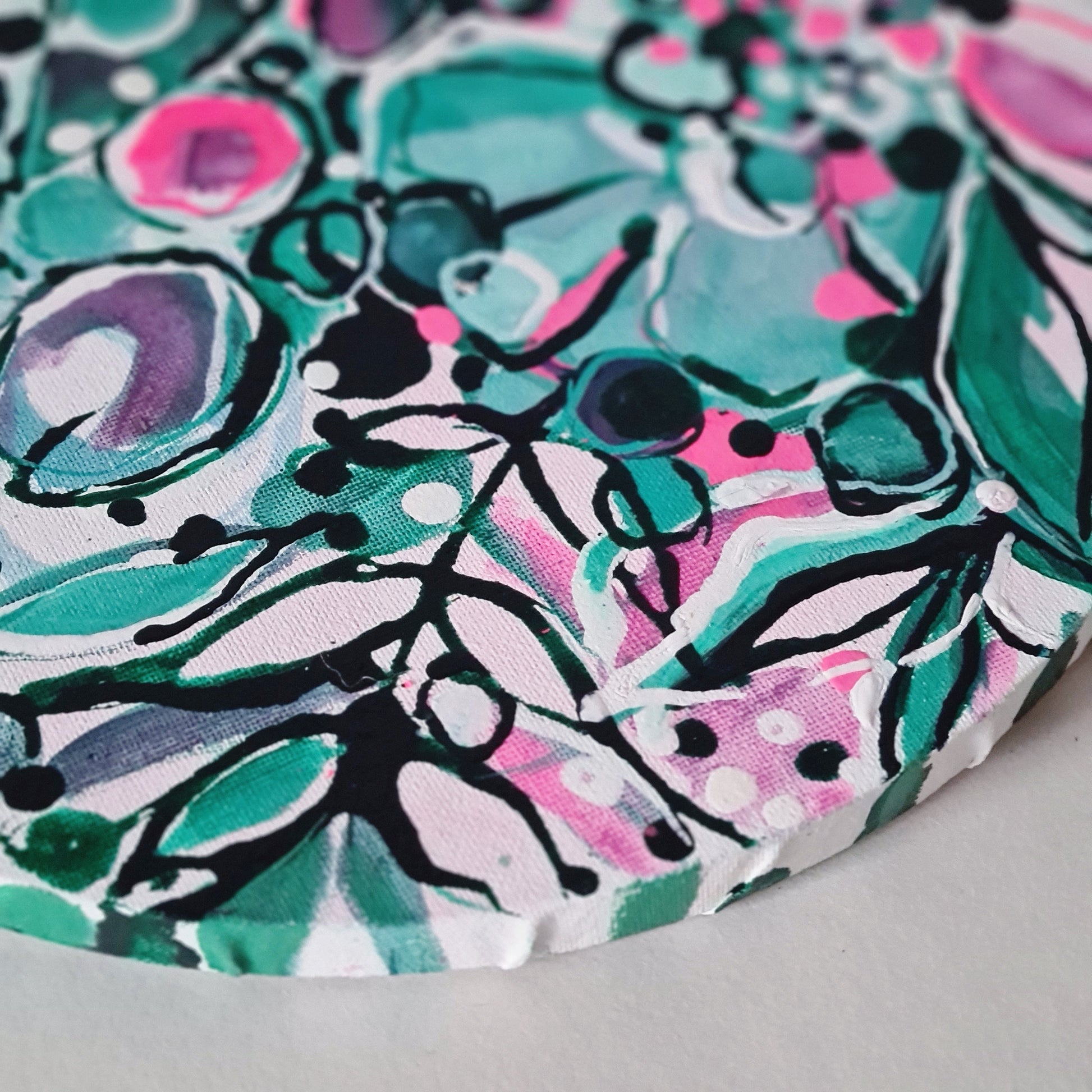 'Breakthrough' An original artwork on circular canvas to represent Summer flowers bursting through to the surface.