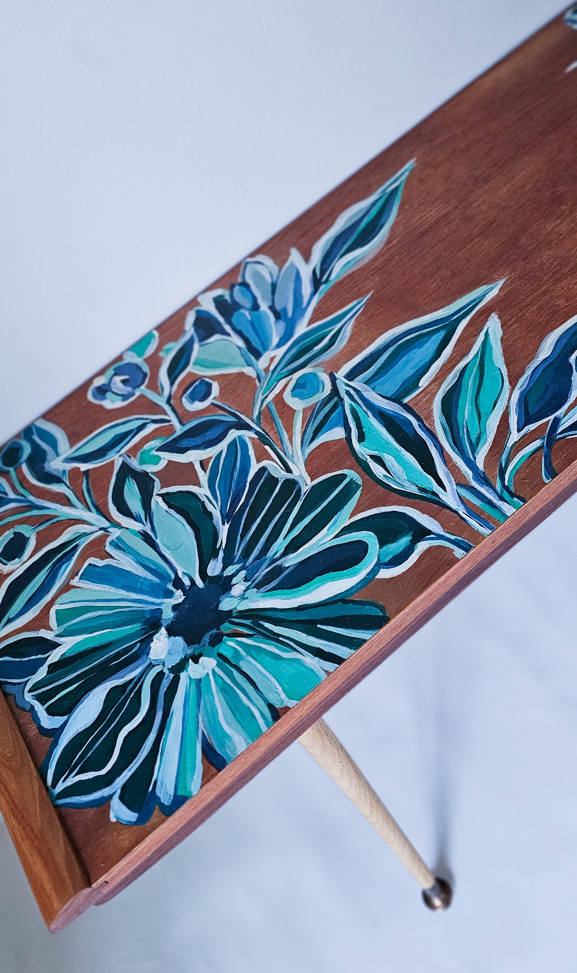 This hand-painted flower design is entirely bespoke and completely unique, with a carefully selected colour palette of blue and green tones such as, turquoise, forest green and mint; then sealed to finish and protect with a clear top coat. I really wanted the design to decorate the ends of the table but leaving a gap in the middle to create a striking contrast!