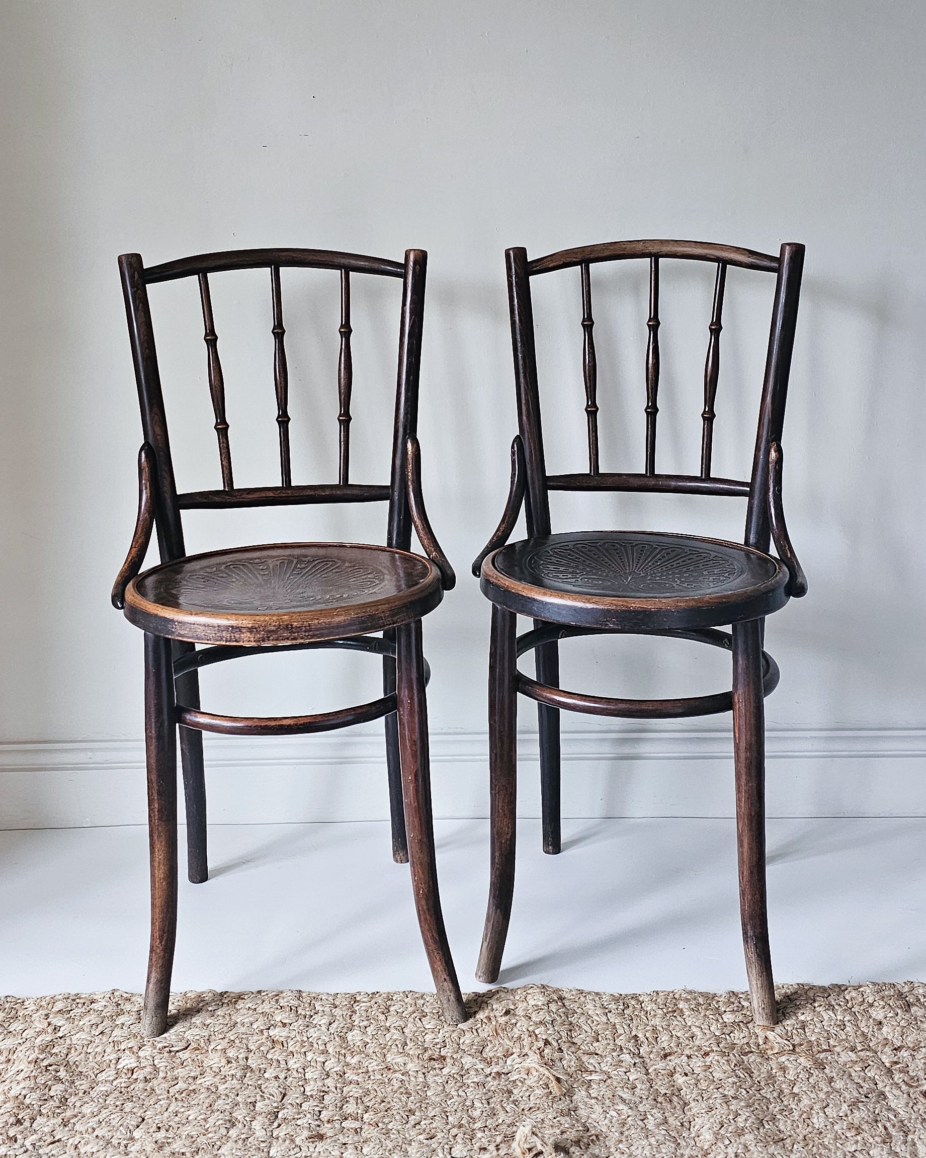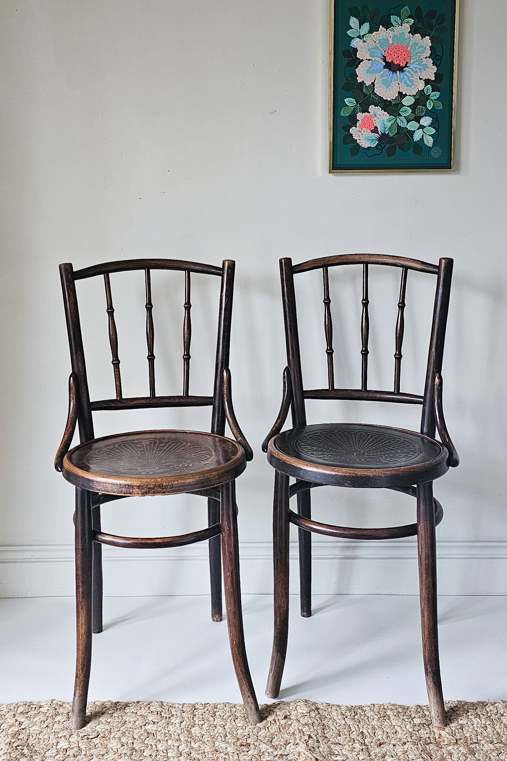 Pair of stunning Antique Thonet Bentwood Chairs as marked on the underside. These are a design classic and instantly recognisable featuring the iconic hooped back and circular seat created by steaming wood into a round shape, hence the name bentwood.