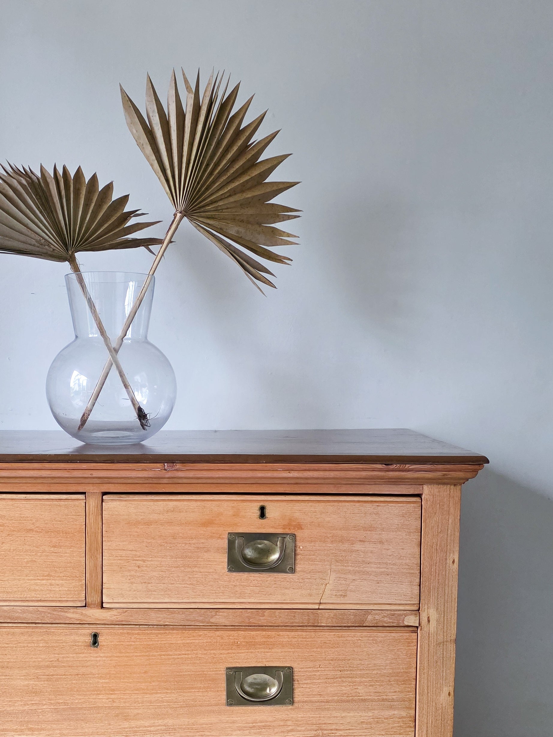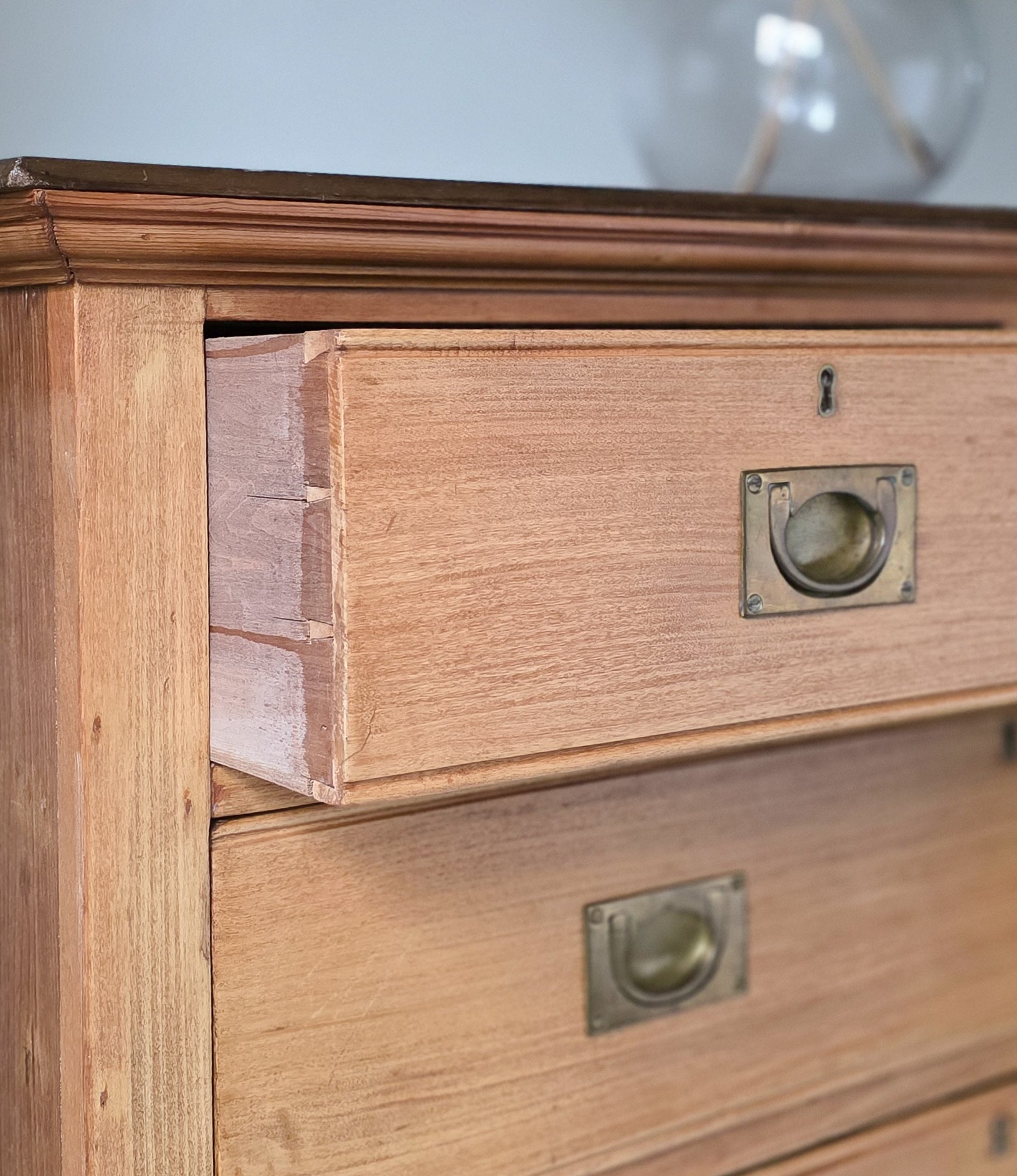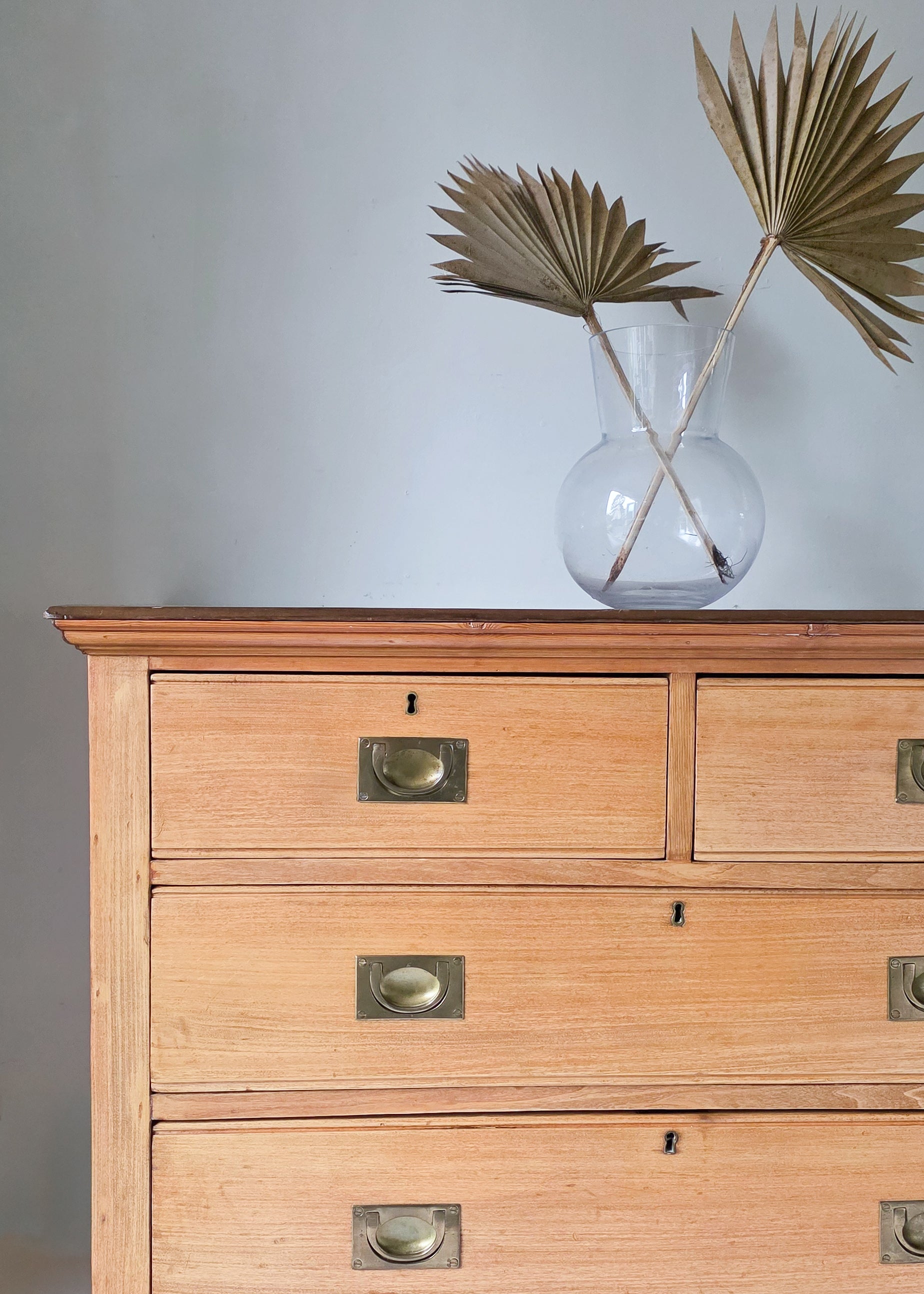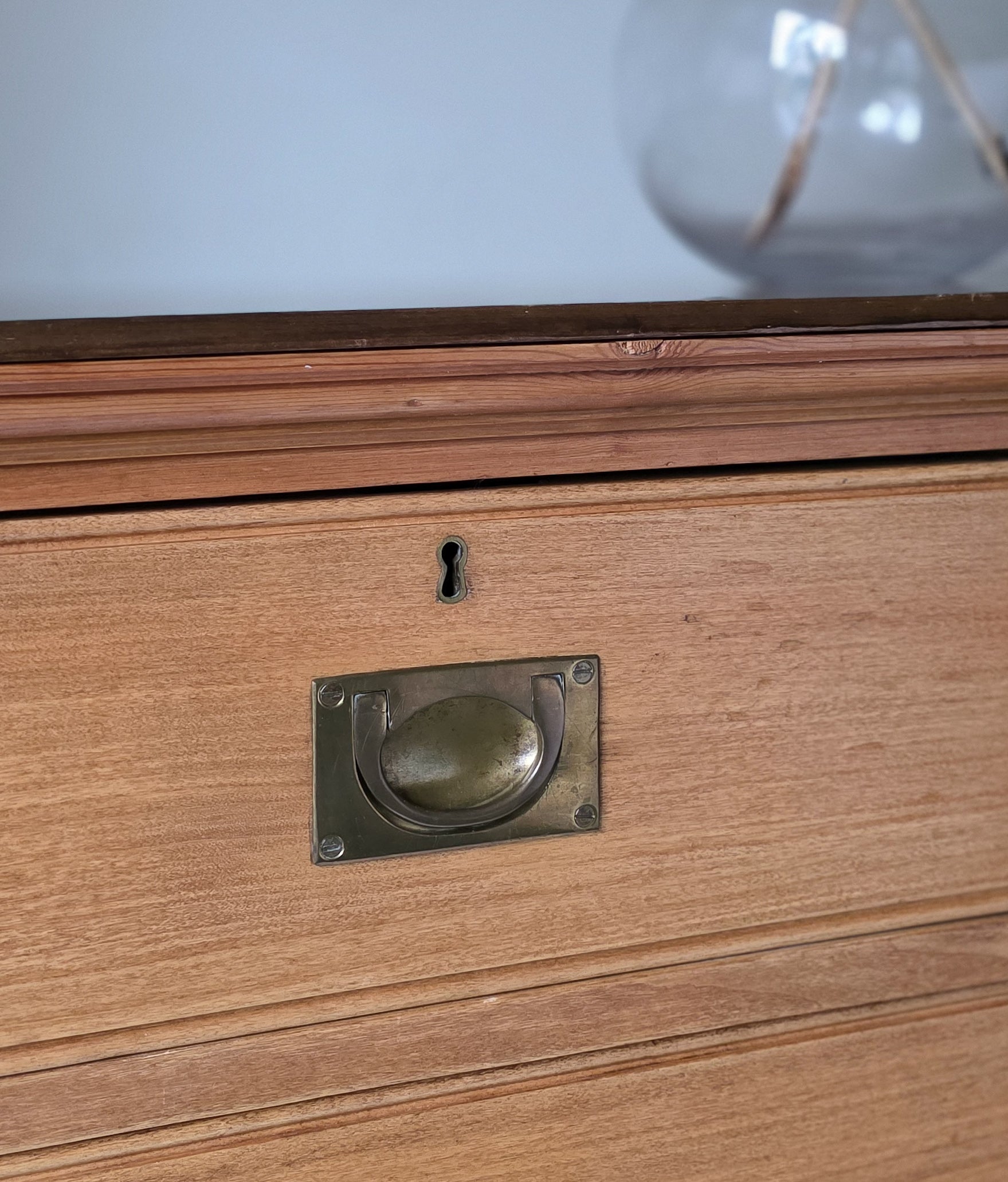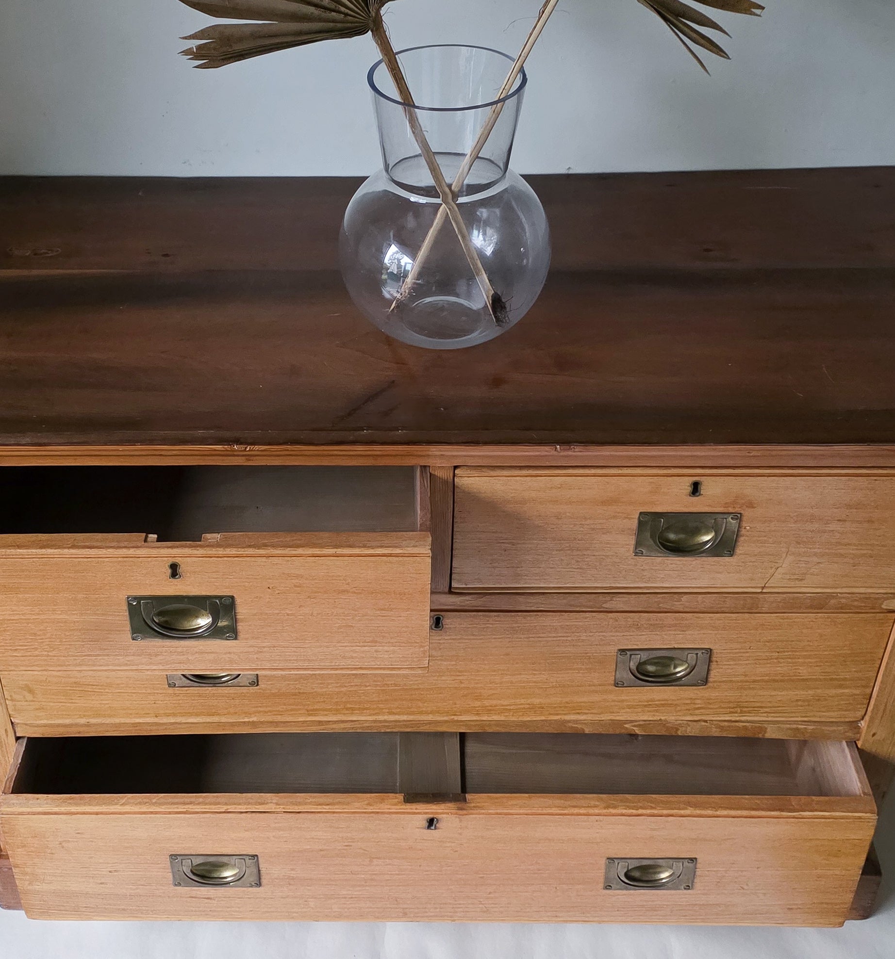 The most beautiful feature I think are the original brass handles which have that military chest feel, inset into the pine drawer fronts, they sit flush as do the original escutchions.
