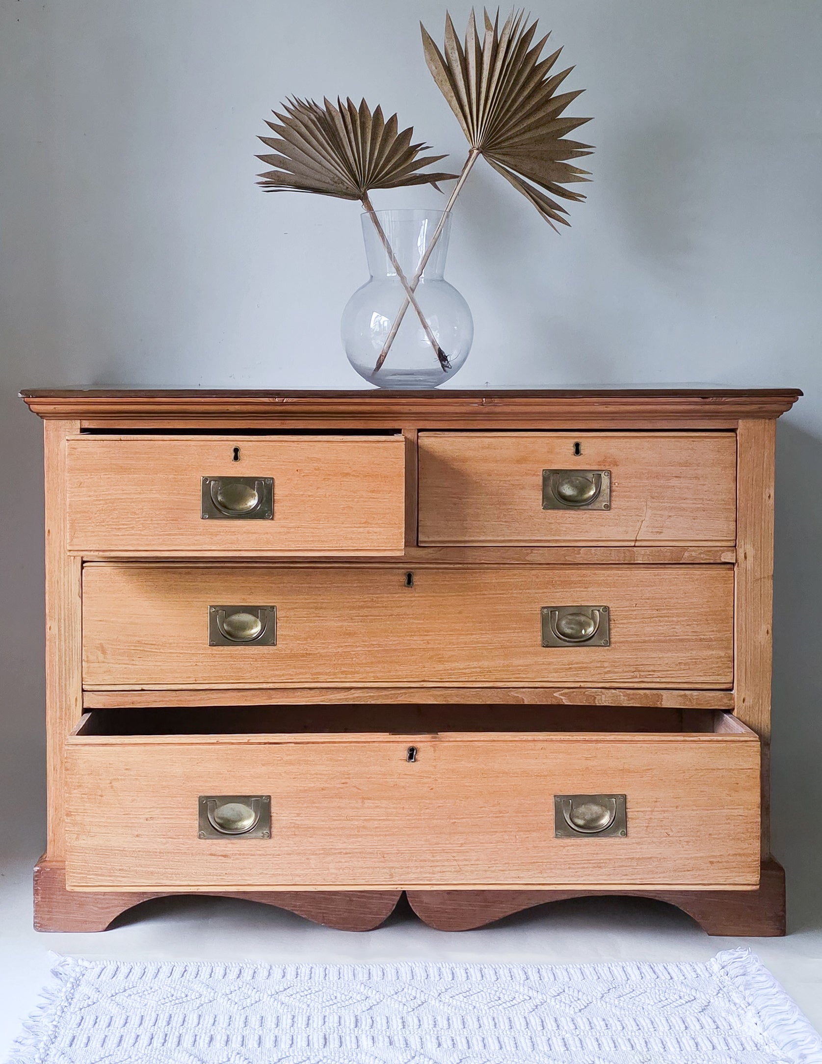 A beautiful example of a solid pine antique Chest of drawers with brass detailing and a stunning aged patina. Dating front the Victorian Era, circa 1890, you can see the age and character of this piece with dovetail joints, solid wood drawer frames, original inset handles, aged authentic patina and the shaped apron on the base which is a lovely addition.