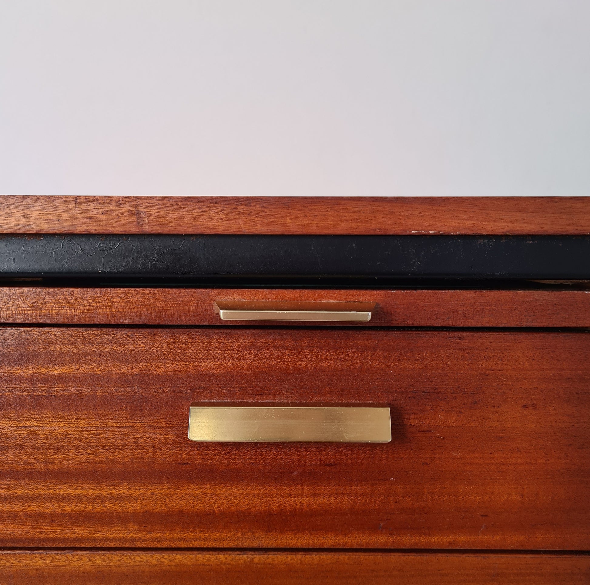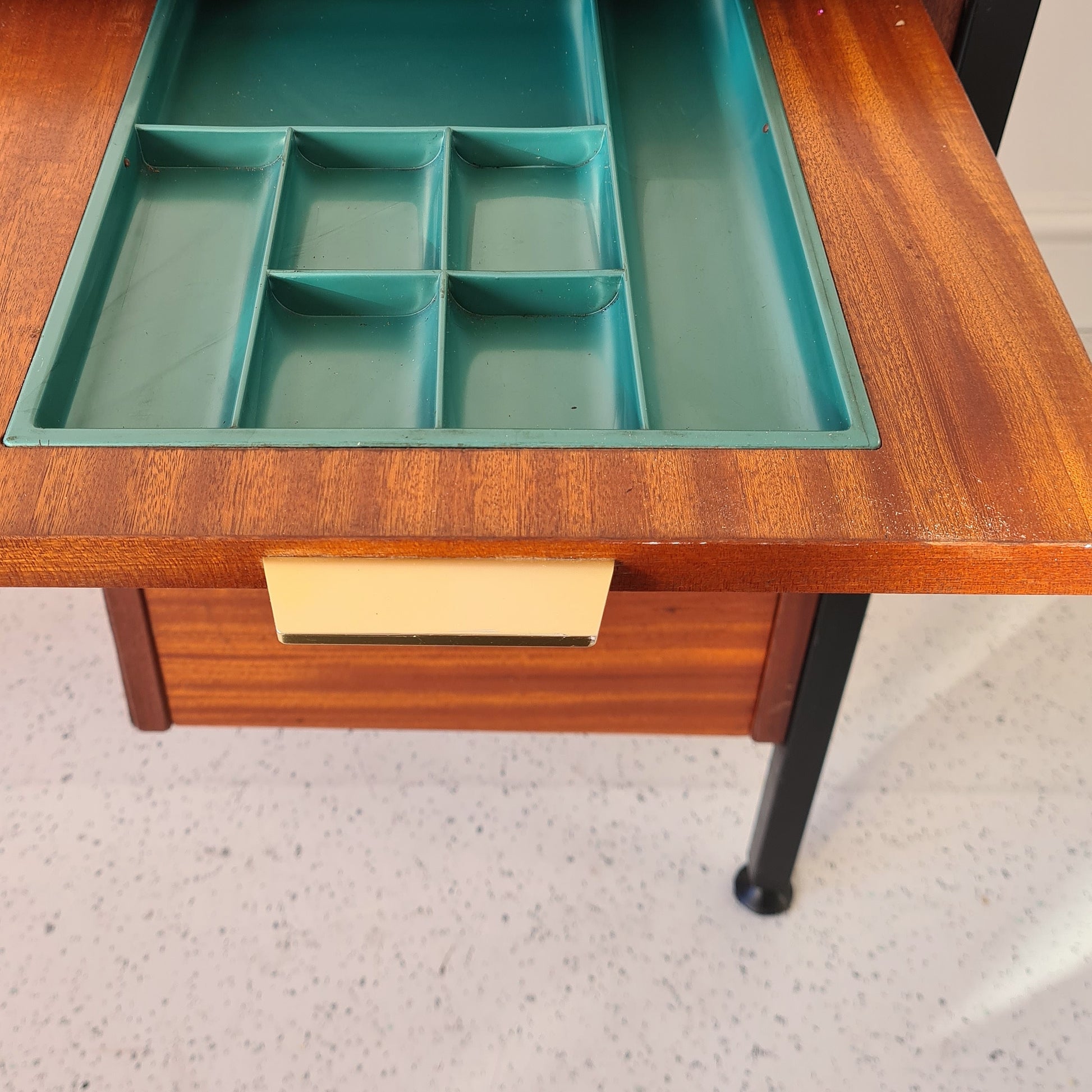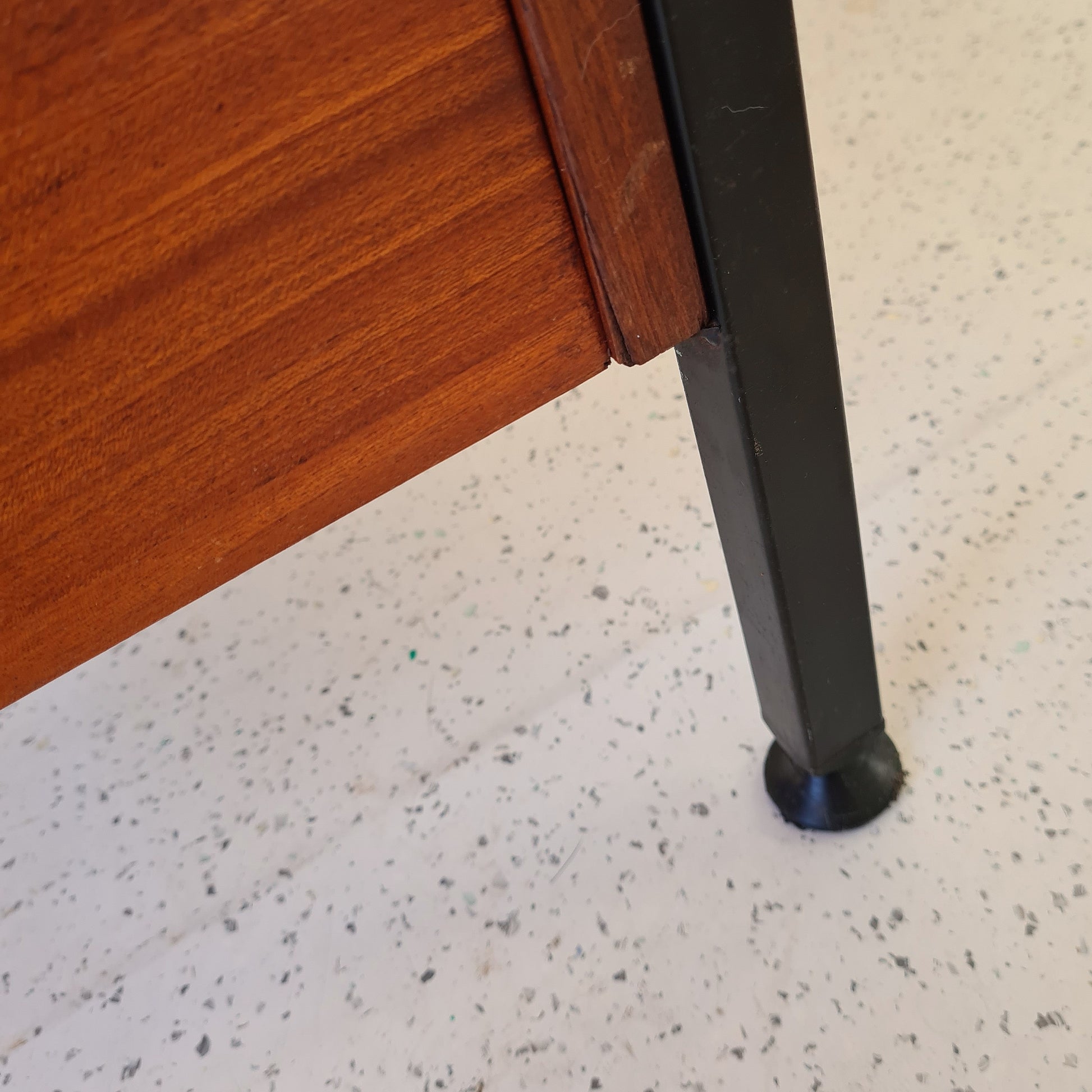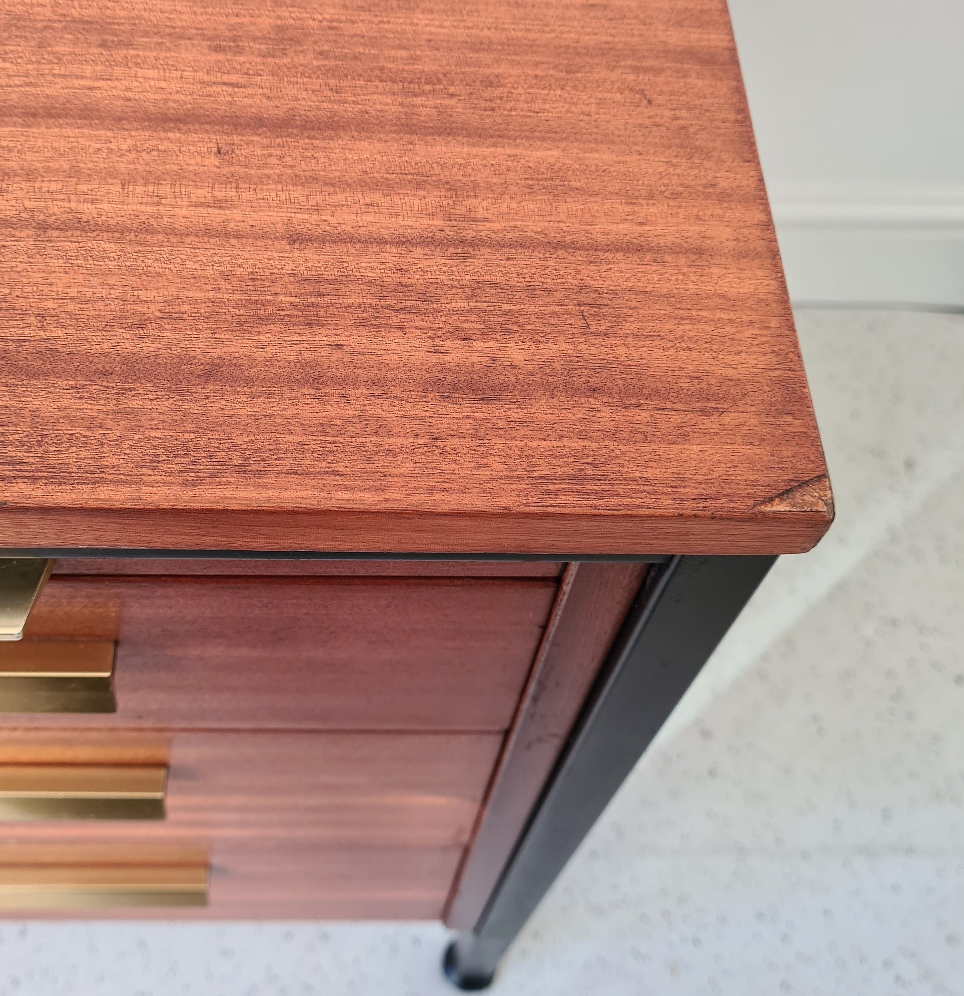 Fully functional and well made with 3 really solid wooden drawers and original brass handles. The top is a tiger stripe teak veneer and the frame made from industrial metal.