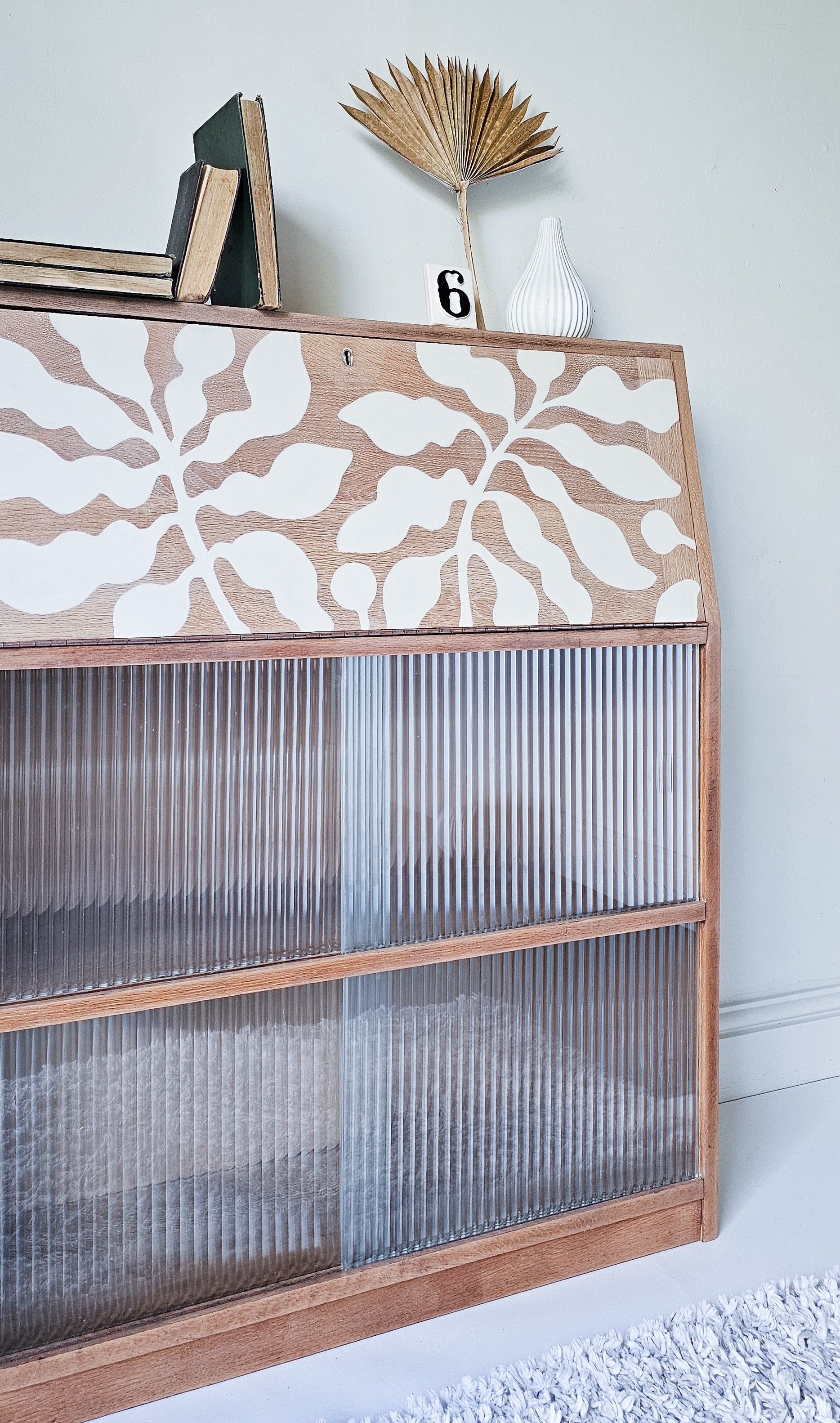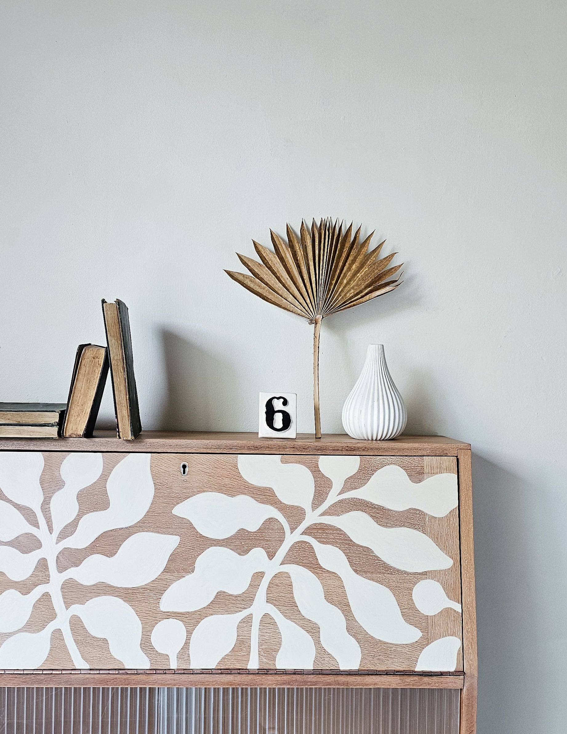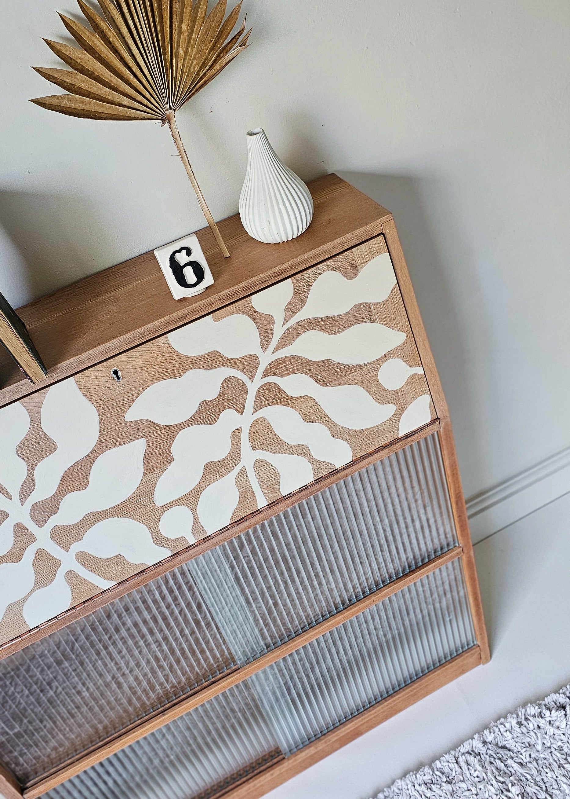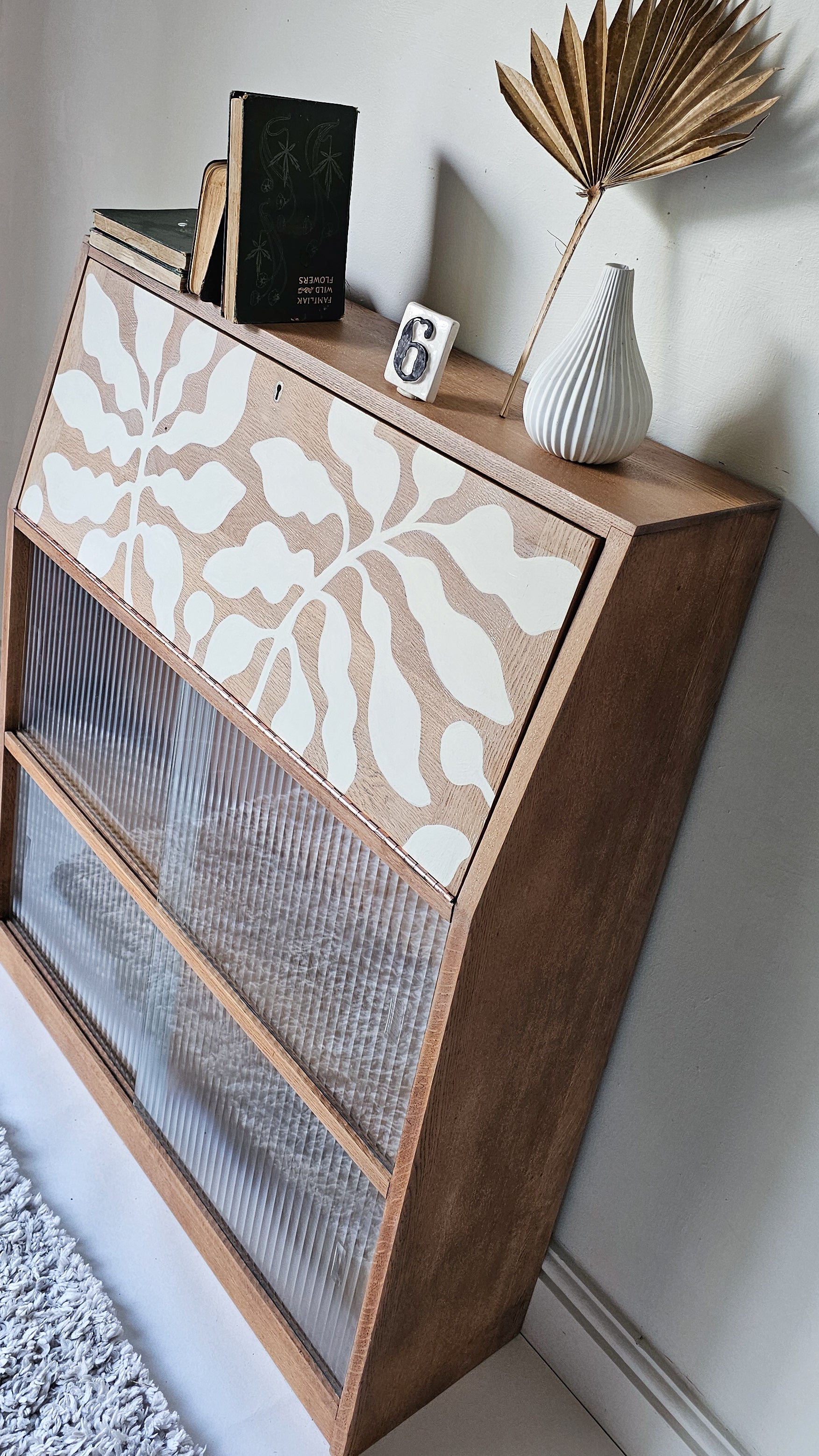 The lovely thing about this bureau is the simple design which has a retro mcm feel, making the perfect backdrop for bespoke hand-painted artwork; A Matisse inspired hand-painted botanical design has been added in off-white for a contemporary look in keeping with the mid century era. The design is bespoke and one of a kind.