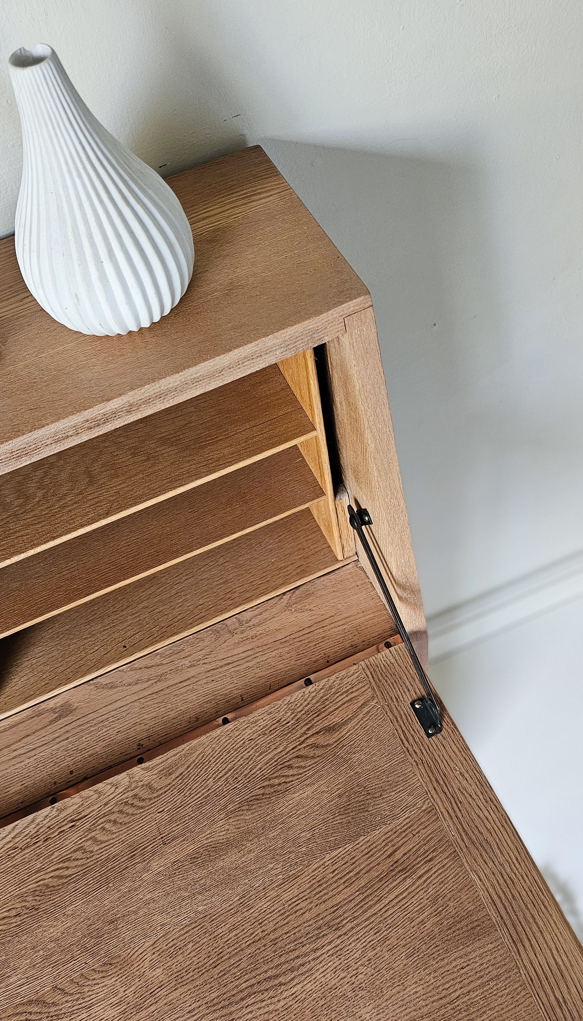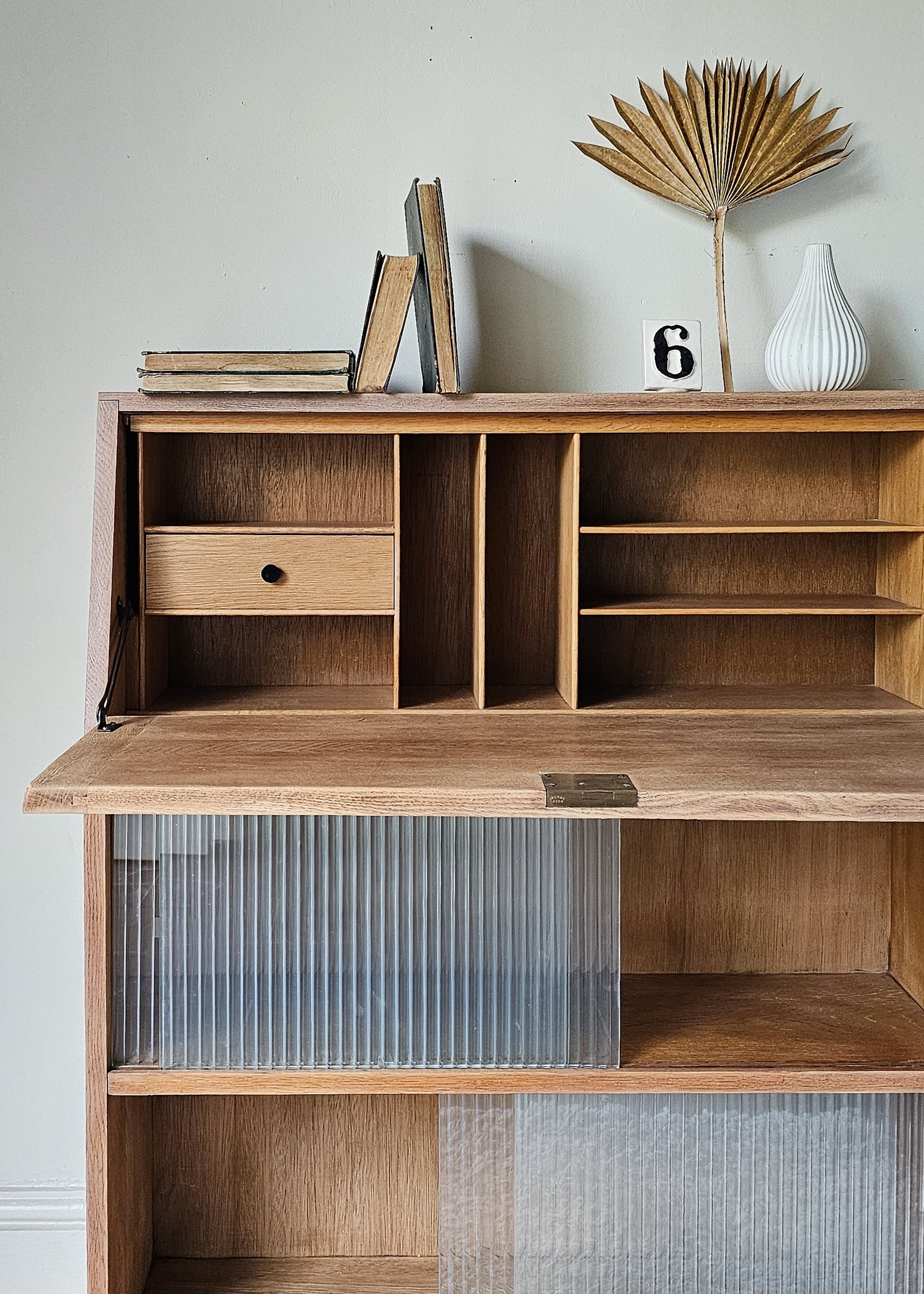 The Alice is a beautiful Mid-century Bureau with clean and simple lines and a slim profile; which has been meticulously restored and refinished with a natural solid oak finish, hand-painted details and reeded glass doors.