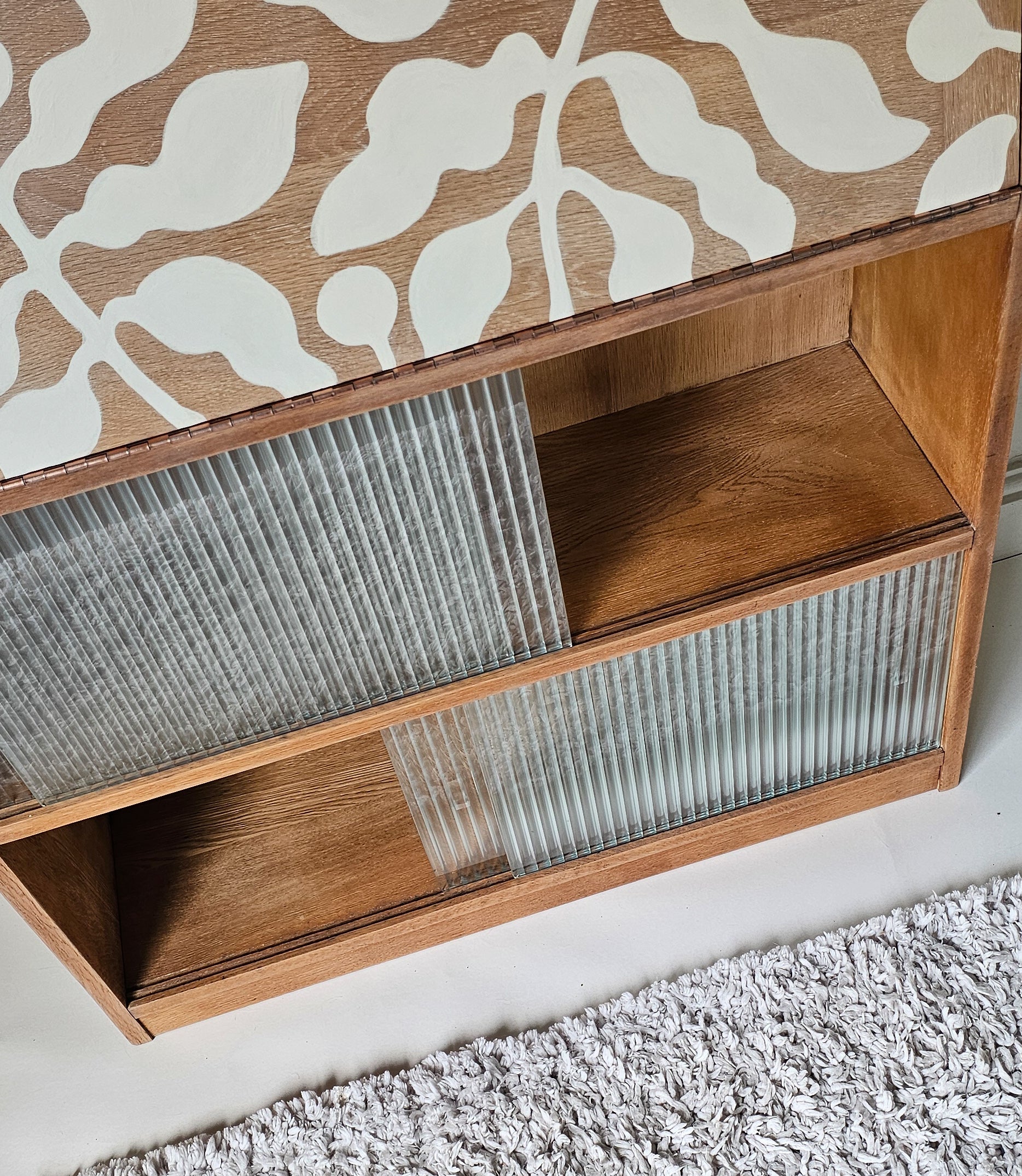 Beneath the desk area is storage for books consisting of 2 compartments with 4 sliding glass doors. Each door is made strong glass with polished edges and has a little handle inset into the surface. The doors have been refinished with a reeded effect to modernise and these all slide smoothly.
